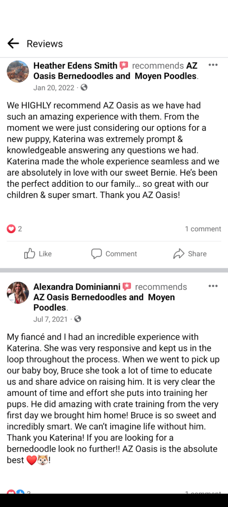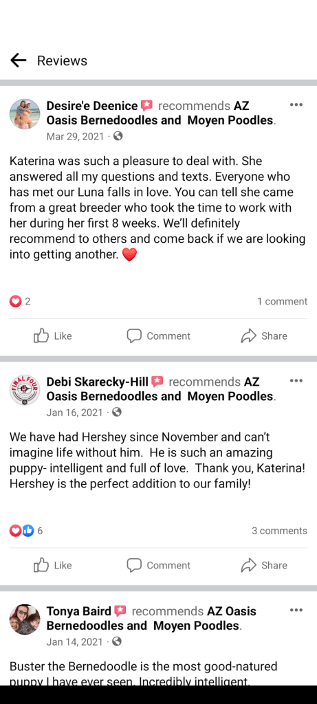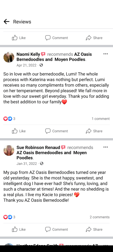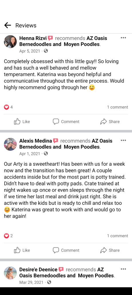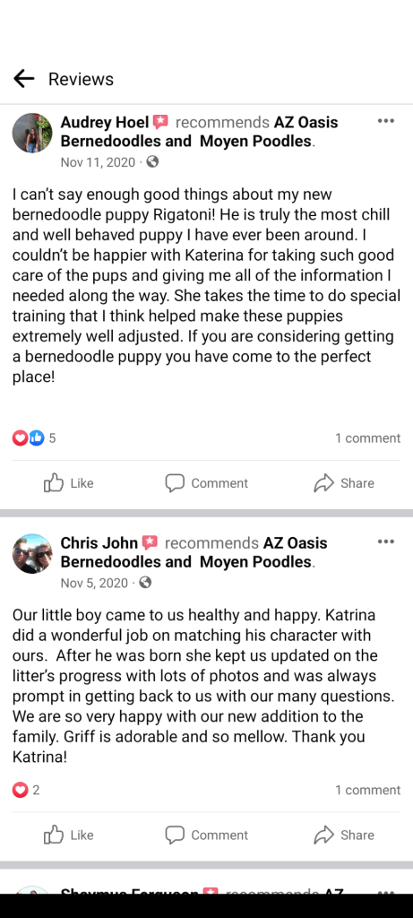Here are links to our Facebook page where so many of our happy families share their feedback and experience with us and post pictures of their fur babies from us . Many post their kind words right in the review section but a few just used comment sections under our pups’ pictures, so check them out too please ❤️.