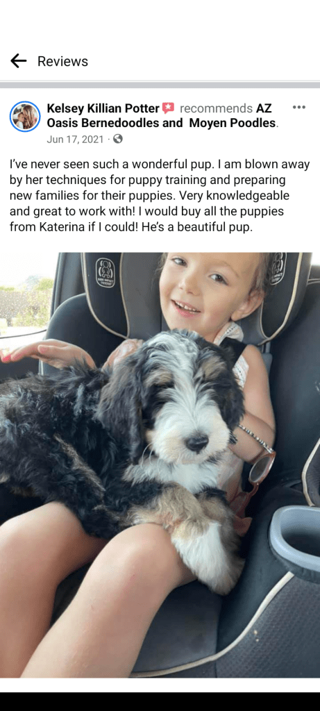 “We just love our new little girl we got from Katerina.🥰 It definitely shows how much time she puts into these pups, they are so loving and smart. She adapted so well within the first couple days and is doing so good on potty training she knows exactly where to go! I would highly recommend Oasis Bernedoodles we have had a great experience from the time we decided to put the deposit down.