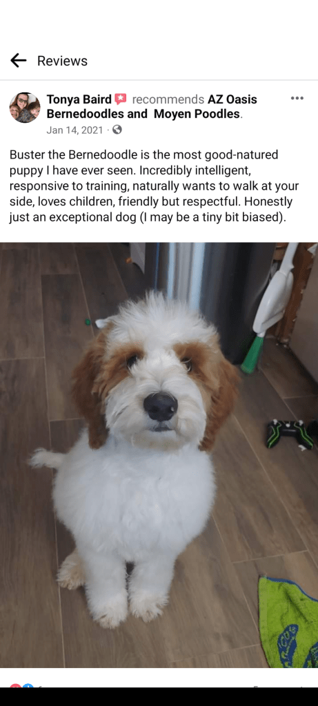“What a blessing it has been to know Katrina and her Bernedoodle Family. Looking for the right pup that will become the right dog for your family is an important decision, and one you don’t want to make hastily or emotionally. Katrina has been amazing at guiding us through this process. We couldn’t be happier. I am excited to post pics of our adorable Bella from AZ Oasis Bernedoodles!” Marla B., Peoria AZ